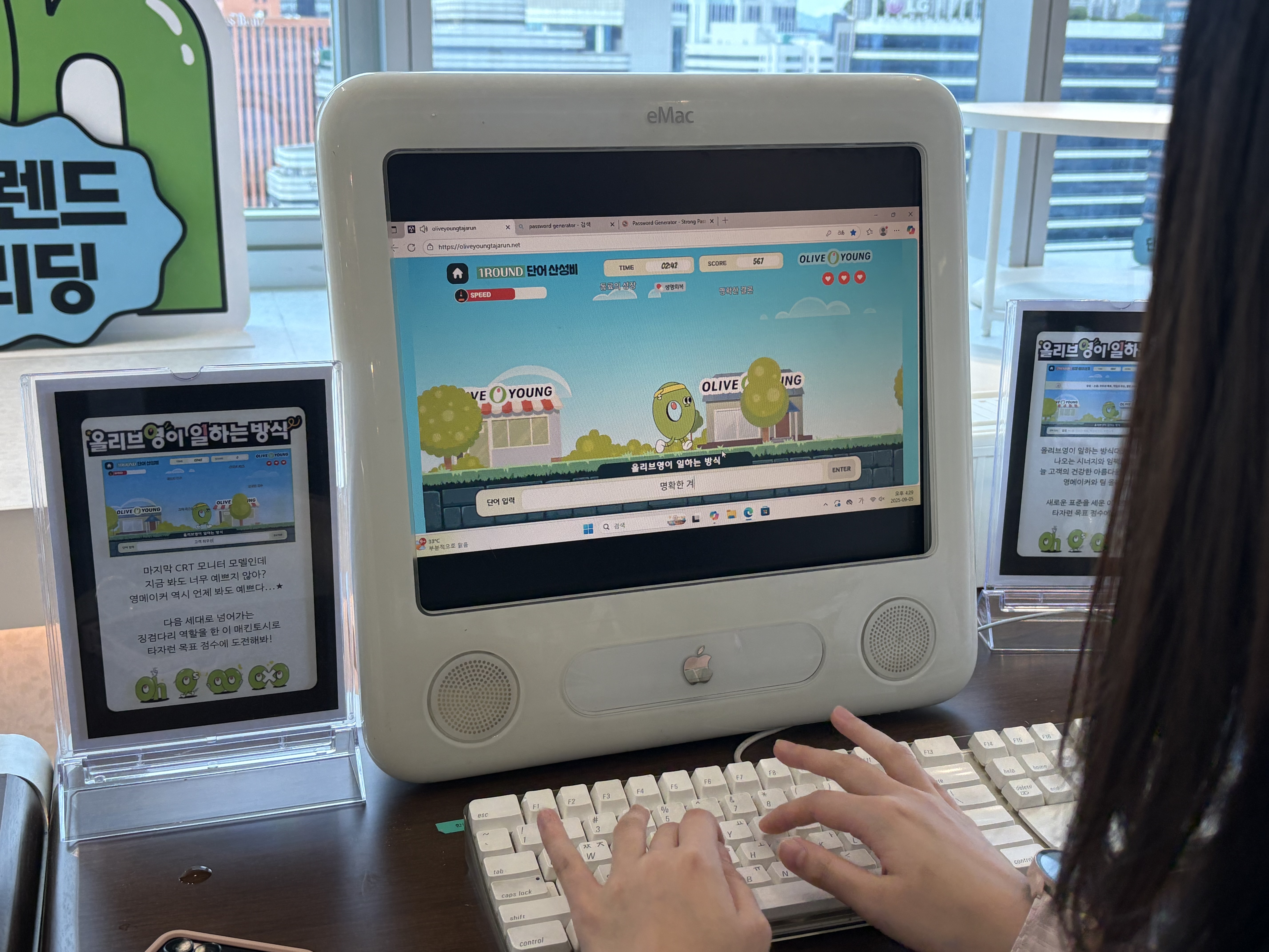 ‘올리브영이 일하는 방식’을 추억의 산성비 한컴 타자게임으로 즐기는 🖥️타자런이 돌아왔다! 올리브영과 애플, 은근 평행이론 들어봤어? ’99년 신사 1호점 오픈과 함께 있던 iMac G3(일명 뚱뚱이 맥), ’15년 명동 플래그십과 나란히한 MacBook까지—늘 혁신을 상징해온 순간들. 그래서 이번 타자런은 동자동 24층에서 당시 실제 애플 컴퓨터들과 함께해. 목표 점수로 게임을 마치면 추첨을 통해 경품까지 노릴 수 있는 특별 이벤트도 준비 완료✨ 빠른 손맛으로 도파민 뿜뿜 원한다면 단어 입력 게임, 영메이커 일하는 방식에 자신 있다면 문장 입력 게임 도전 추천