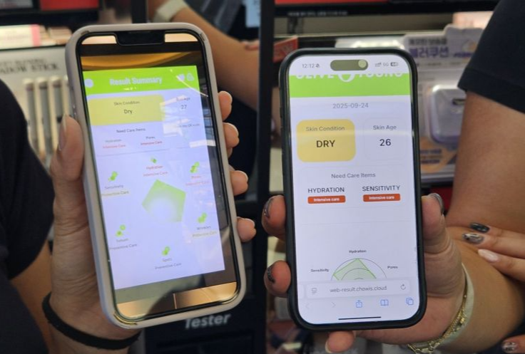 올리브영 부산전포역점에서 외국인 관광객이 피부타입 진단 테스트 결과를 공유하는 모습-아시아경제