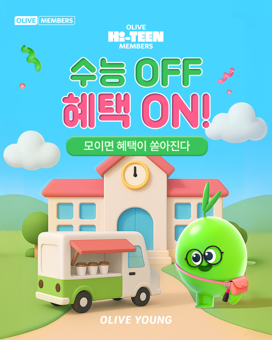 교문 앞에 쏟아지는 햇살보다 더 반짝이는 건 바로 '자유'...! 그저 평범한 목요일이라고 생각했던 어제가 사실은 또 그 수능일이었다니. 그럼에도 누군가는 매년 이 거대한 관문을 통과하고, 곧 소중한 올리브영의 단골 고객이 되어 오겠지. 만 14세부터 19세까지- 우리는 그들을 💚올리브 하이틴(Hi-TEEN) 멤버스라 부르기로 했어. 그동안 정말 고생했다고, 매장에서 마주치면 마음껏 격려해주자. 뷰티 인생의 서막은 이제부터니까. 오늘부터 일주일 동안 다양한 할인 쿠폰과 미니 틴트 증정은 물론, 12월에는 고등학교로 직접 찾아가는 강연 프로그램까지. 올리브 하이틴 멤버스를 위한 응원 프로젝트는 계속된다. 샤라웃 투🙌 멤버십마케팅팀~!