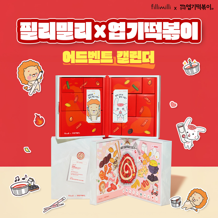 이거 나만 예상하지 못했을까, 필리밀리 X 엽떡 한정판 캘린더. 엽떡 할인쿠폰과 굿즈, 필리밀리 인기 베스트템까지 꽉 채운 구성으로 어제 (20일) 올영 온라인몰에서 단독 공개됐어. 연말 인싸력을 올려줄 언박싱 아이템을 찾고 있다면, 분모자, 중국 당면, 치즈 추가한 엽떡 주문하고 (허니콤보 곁들여서) 제대로 어드밴트 캘린더 한번 즐겨봐💚