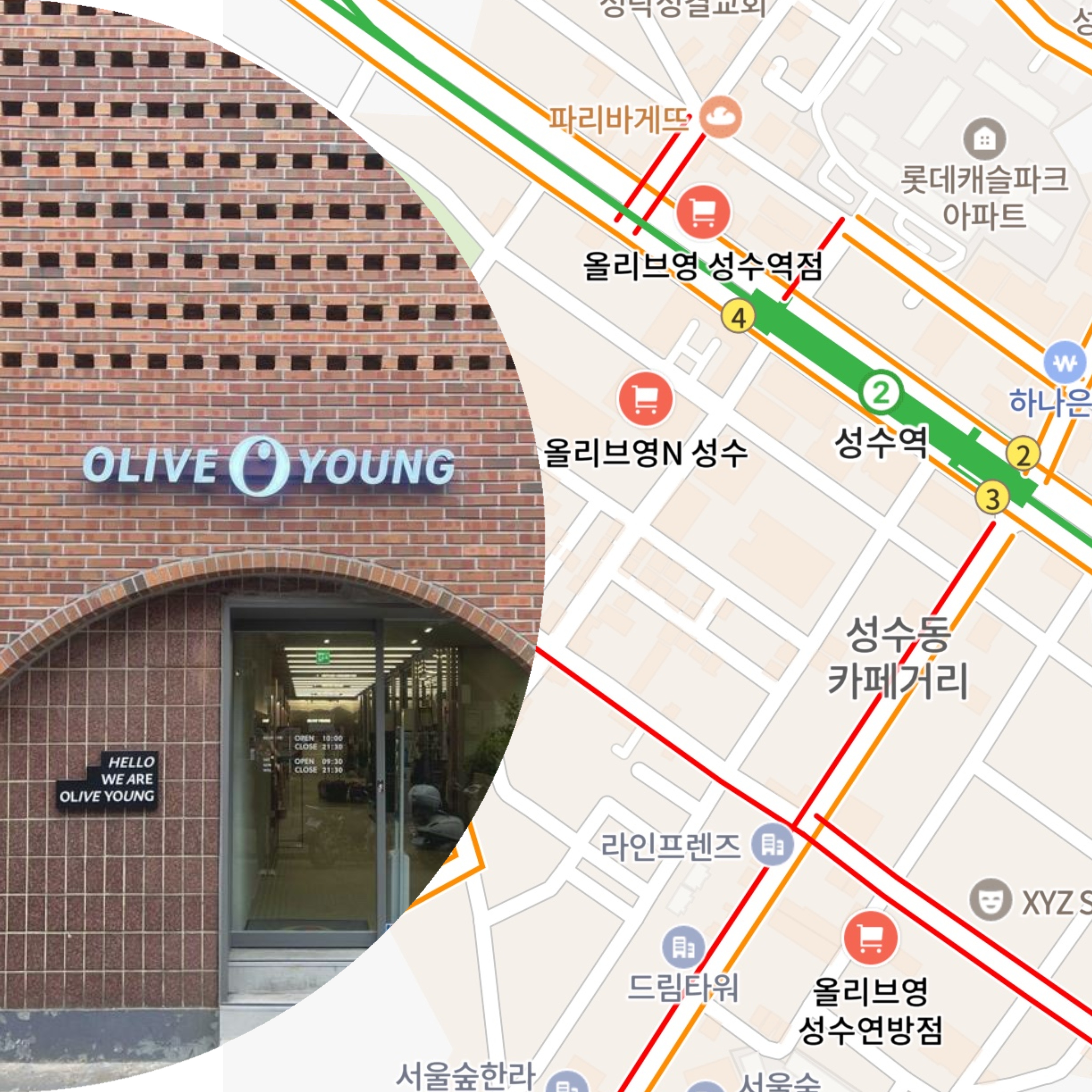 명동 못지않게 붐비는 성수 상권. 그 한복판엔 2호선 성수역을 지키는 ‘올리브영 삼형제’가 살고 있어. 맏형 올리브영N 성수가 K뷰티 체험의 정수를 보여주는 공간이라면, 둘째 올리브영 성수연방점은 로컬 감성 그득한 문화복합공간 1층에서 존재감을 뿜어내는 타입. 원래 70년대 화학공장이던 건물을 리모델링한 곳이라 1~3층 모두 빈티지 벽돌로 꾸며져 있어 외관부터 포토스팟각 분.좋.카 성수 핫플, 감성 소품샵, 그리고 매번 바뀌는 K팝업까지, 성수 특유의 갬성을 통째로 씹어 삼키는 동네 그 자체지. 갬성에 취해 두 손이 조금 무거워졌다면? 바로 옆 정원 테라스에 잠시 앉아 가을 한 번 타보는 것도 성수 루틴👍 참, 셋째는 누구냐고? 성수 로컬들의 출퇴근과 데일리 루틴을 묵묵히 지켜보는 성수역 1번 출구 지킴이 올리브영 성수역점, 찡긋-
